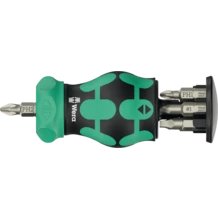 Un porta-puntas manual especialmente pequeño con una toma extremamente corta para trabajos en áreas difícilmente accesibles. La carraca que se encuentra integrada en el mango dispone de un dentado fino y permite un trabajo muy veloz. La conmutación del sentido de giro sucede de forma intuitiva: al girar el conmutador anular hacia la derecha, se atornilla en dirección hacia la derecha, y al girar el conmutador anular hacia la izquierda, se atornilla hacia la izquierda. Para realizar trabajos de precisión, el mecanismo de carraca puede desactivarse por medio de la posición 0. Incluye 6 puntas duras y resistentes para el uso universal. El fuerte imán permanente que se encuentra en la toma de las puntas, proporciona un alojamiento seguro de la punta. El mango Kraftform bicomponente con su combinación tan útil de zonas duras y blandas, permite un agarre fuerte y un trabajo sumamente preciso.