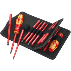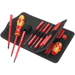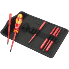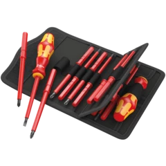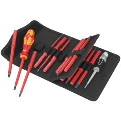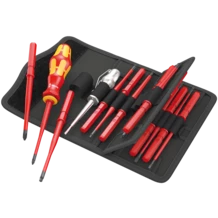 14 varillas intercambiables con diámetro reducido para acceder a elementos de tornillos y muelles en posiciones profundas y realizar trabajos en ellos. Destornillador porta-puntas 817 VDE Kraftform para un trabajo ergonómico, y buscapolos en bolso robusto para llevar en el cinturón. Herramientas probadas una por una según la norma IEC 60900. Se realizan pruebas individuales a 10.000 V para poder garantizar un trabajo seguro bajo la tensión permitida de 1.000 V.