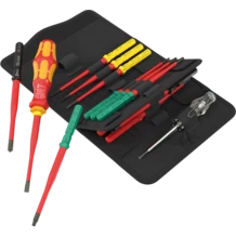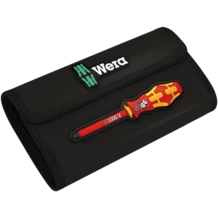 1 porta-puntas manual 817 VDE Kraftform y 14 varillas intercambiables VDE con el sistema de búsqueda de herramientas Take it easy: con marcas a color e indicaciones del tamaño grabadas con láser. Con un diámetro reducido con aislamiento integrado de las varillas, así también es posible acceder a elementos de uniones atornilladas y de muelles a profundidad, y realizar los trabajos necesarios. Las herramientas han sido probadas en un 100 % según IEC 60900. La prueba individual se realiza bajo una tensión de 10.000 V para asegurar un trabajo seguro bajo la tensión permitida de 1.000 V. 1 buscapolos monofásico. El conjunto viene en un bolso robusto para el cinturón. En la parte posterior, este bolso de material textil dispone de una zona autoadhesiva esponjosa. Por medio de la cinta autoadhesiva que viene con el producto, el bolso textil se puede conectar con los componentes de Wera 2go. Pero también es posible fijarlo en la pared, la estantería o el carro de herramientas del taller.