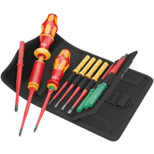Juego de 16 piezas de varillas intercambiables dinamométricas VDE. Incluye 14 varillas (12 de ellas con diámetro reducido de varilla) con aislamiento de protección integrado. Lleva el sistema de búsqueda de herramientas Take it easy: con marcas a color e indicaciones del tamaño grabadas con láser - para encontrar la herramienta necesaria de manera más fácil y rápida. Un porta-puntas dinamométrico VDE con un par de giro ajustable de 1,2-3,0 Nm y un porta-puntas 817 VDE. Ambos con un mango ergonómico Kraftform Plus, en el cual las zonas duras de agarre permiten altas velocidades de trabajo, mientras que las zonas blandas garantizan una alta transmisión de la fuerza.