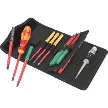 1 porta-puntas manual 817 VDE Kraftform, 14 varillas intercambiables VDE con el sistema de búsqueda de herramientas Take it easy: con marcas a color e indicaciones del tamaño grabadas con láser - para encontrar la herramienta precisa de forma rápida y fácil; 1 buscapolos monofásico. Las herramientas han sido probadas en un 100 % según IEC 60900. La prueba individual se realiza bajo una tensión de 10.000 V para asegurar un trabajo seguro bajo la tensión permitida de 1.000 V. Vienen en un bolso robusto para el cinturón. En la parte posterior, este bolso de material textil dispone de una zona autoadhesiva esponjosa. Por medio de la cinta autoadhesiva que viene con el producto, el bolso textil se puede conectar con los componentes de Wera 2go. Pero también es posible fijarlo en la pared, la estantería o el carro de herramientas del taller.