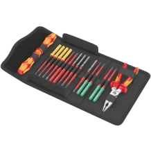 2 porta-puntas manuales 817 VDE para varillas intercambiables VDE; 14 varillas intercambiables VDE (cada una de 157 mm de largo) con un diámetro reducido de las varillas (artículo Kraftform Kompakt 60 i Take it easy 0,4x2,5 y Kraftform Kompakt 67 i Take it easy TX 10 varilla de diámetro estándard); así también es posible acceder a elementos de uniones atornilladas y de muelles a profundidad, y realizar los trabajos necesarios. Con el sistema de búsqueda de herramientas Take it easy: marcas a color según el perfil e indicaciones del tamaño grabadas con láser, para encontrar la herramienta necesaria de forma fácil y rápida. Las herramientas han sido probadas en un 100 % según IEC 60900 bajo una tensión de 10.000 V para asegurar un trabajo seguro bajo la tensión permitida de 1.000 V. 1 tenaza de instalaciones eléctricas Knipex VDE 13 96 200; la tenaza sustituye hasta 6 herramientas individuales para el área de la instalación eléctrica: cortar, aislar, agarrar, torcer, desbarbar y crimpar - todo en una sola herramienta. Lleva un trinquete de bloqueo para un agarre suave. Lleva un cromado para una mejor protección anticorrosiva, con camisa de agarre aislada multicomponente. Viene en un bolso robusto para el cinturón. En la parte posterior, este bolso de material textil dispone de una zona autoadhesiva esponjosa. Por medio de la cinta autoadhesiva que viene con el producto, el bolso textil se puede conectar con los componentes de Wera 2go. Pero también es posible fijarlo en la pared, la estantería o el carro de herramientas del taller.