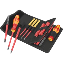 2 porta-puntas manuales 817 VDE Kraftform, 12 varillas intercambiables VDE con el sistema de búsqueda de herramientas Take it easy: con marcas a color e indicaciones del tamaño grabadas con láser - para encontrar la herramienta precisa de forma fácil y rápida. 4 llaves de armarios de distribución. Las herramientas han sido probadas en un 100 % según IEC 60900. La prueba individual se realiza bajo una tensión de 10.000 V para asegurar un trabajo seguro bajo la tensión permitida de 1.000 V. Vienen en un bolso robusto para el cinturón. En la parte posterior, este bolso de material textil dispone de una zona autoadhesiva esponjosa. Por medio de la cinta autoadhesiva que viene con el producto, el bolso textil se puede conectar con los componentes de Wera 2go. Pero también es posible fijarlo en la pared, la estantería o el carro de herramientas del taller.