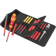 1 porta-puntas manual 817 VDE Kraftform, 12 varillas intercambiables VDE con el sistema de búsqueda de herramientas Take it easy: con marcas a color e indicaciones del tamaño grabadas con láser - para encontrar la herramienta precisa de forma fácil y rápida. 4 llaves de armarios de distribución, 1 buscapolos monofásico. Las herramientas han sido probadas en un 100 % según IEC 60900. La prueba individual se realiza bajo una tensión de 10.000 V para asegurar un trabajo seguro bajo la tensión permitida de 1.000 V. Vienen en un bolso robusto para el cinturón. En la parte posterior, este bolso de material textil dispone de una zona autoadhesiva esponjosa. Por medio de la cinta autoadhesiva que viene con el producto, el bolso textil se puede conectar con los componentes de Wera 2go. Pero también es posible fijarlo en la pared, la estantería o el carro de herramientas del taller.