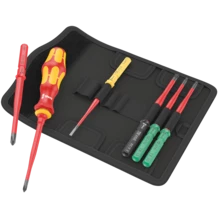 1 porta-puntas manual 817 VDE Kraftform y 6 varillas intercambiables VDE con el sistema de búsqueda de herramientas Take it easy: con marcas a color e indicaciones del tamaño grabadas con láser. Con un diámetro reducido de las varillas con un aislamiento de protección integrado, así también es posible acceder a elementos de uniones atornilladas y de muelles a profundidad, y realizar los trabajos necesarios. Las herramientas han sido probadas en un 100 % según IEC 60900. La prueba individual se realiza bajo una tensión de 10.000 V para asegurar un trabajo seguro bajo la tensión permitida de 1.000 V. Vienen en un bolso robusto para el cinturón. En la parte posterior, este bolso de material textil dispone de una zona autoadhesiva esponjosa. Por medio de la cinta autoadhesiva que viene con el producto, el bolso textil se puede conectar con los componentes de Wera 2go. Pero también es posible fijarlo en la pared, la estantería o el carro de herramientas del taller.