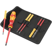 1 porta-puntas manual 817 VDE Kraftform y 6 varillas intercambiables VDE con el sistema de búsqueda de herramientas Take it easy: con marcas a color e indicaciones del tamaño grabadas con láser. Las herramientas han sido probadas en un 100 % según IEC 60900. La prueba individual se realiza bajo una tensión de 10.000 V para asegurar un trabajo seguro bajo la tensión permitida de 1.000 V. Vienen en un bolso robusto para el cinturón. En la parte posterior, este bolso de material textil dispone de una zona autoadhesiva esponjosa. Por medio de la cinta autoadhesiva que viene con el producto, el bolso textil se puede conectar con los componentes de Wera 2go. Pero también es posible fijarlo en la pared, la estantería o el carro de herramientas del taller.