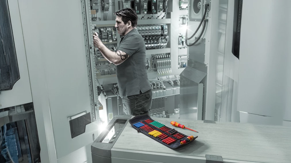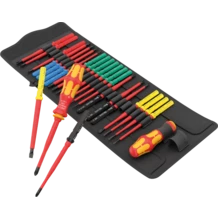 Juego de 26 piezas Kraftform Kompakt VDE, 2 mangos porta-puntas 817 VDE Kraftform, 24 varillas intercambiables VDE (de un largo de 157 mm) , en gran parte con un diámetro reducido de las varillas (iS), así también es posible acceder a elementos de uniones atornilladas y de muelles a profundidad, y realizar los trabajos necesarios. Las herramientas han sido probadas en un 100 % según IEC 60900. La prueba individual se realiza bajo una tensión de 10.000 V para asegurar un trabajo seguro bajo la tensión permitida de 1.000 V. Lleva el sistema de búsqueda de herramientas Take it easy: con marcas a color según el perfil e indicaciones del tamaño grabadas con láser - para encontrar la herramienta necesaria de manera más fácil y rápida. El mango Kraftform Plus permite un trabajo ergonómico agradable que evita la formación de ampollas y callosidades en las manos del usuario. Las zonas duras de agarre permiten altas velocidades de trabajo, mientras que las zonas blandas garantizan una alta transmisión de la fuerza. El sistema de protección antirrodamiento mediante un hexágono evita que el útil se ruede de forma indeseada durante el trabajo.