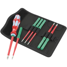 1 porta-puntas 3817 VDE Kraftform para un trabajo ergonómico. 7 varillas VDE intercambiables de acero inoxidable, en parte con un diámetro reducido de las varillas (iS), así también es posible acceder a elementos de uniones atornilladas y de muelles a profundidad, y realizar los trabajos necesarios; lleva el sistema de búsqueda de herramientas Take it easy: con marcas a color según el perfil e indicaciones del tamaño grabadas con láser - para encontrar la herramienta precisa más facil- y rápidamente. Las herramientas han sido probadas en un 100 % según IEC 60900. La prueba individual se realiza bajo una tensión de 10.000 V para asegurar un trabajo seguro bajo la tensión permitida de 1.000 V. Las herramientas de acero inoxidable de Wera han sido endurecidas por congelación al vacío, y así disponen de los valores de dureza y resistencia que se necesitan para los trabajos de atornillar. El uso industrial es posible sin ninguna clase de limitaciones. Vienen en un bolso robusto para llevar en el cinturón. El bolso lleva un sistema autoadhesivo en su parte posterior, y se puede conectar así con los componentes de Wera 2go, pero también es posible fijarlo en la pared, la estantería o el carro de herramientas del taller.