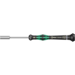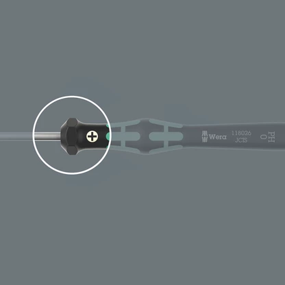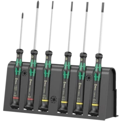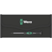 Juego de destornilladores Wera Micro de alta calidad, para uniones atornilladas de mecánica de precisión. Por medio del apoyo de la mano en el sombrerete giratorio, y gracias a la zona de giro rápido situada por debajo del sombrerete giratorio, se consigue un movimiento de retorcimiento ultrarrápido. Se gana tiempo al no tener que cambiar de agarre una y otra vez. La zona de potencia con las zonas blandas que lleva integradas permite la transmisión de pares altos de desapriete y apriete. La zona de precisión sirve para el ángulo de giro correcto en trabajos de ajuste. La punta Black Point ofrece gran exactitud de posicionamiento y una protección anticorrosiva optimizada. Incluye una bandeja práctica para el alojamiento ordenado y sistemático de los destornilladores.