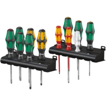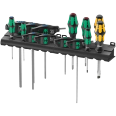 Juego universal de destornilladores de 12 piezas. El mango Kraftform multicomponente del destornillador proporciona un trabajo agradable y ergonómico que evita ampollas y callosidades. Las zonas duras de agarre permiten una alta velocidad de trabajo mientras que las zonas blandas de agarre garantizan una alta transmisión del par de giro. En parte llevan Lasertip: la punta de los destornilladores Lasertip de Wera recibe un tratamiento de lijado microscópicamente fino con ayuda de rayos láser. Esta superficie rugosa se aferra fuertemente a la cabeza del tornillo. Así, ya no es posible que el útil involuntariamente se desprenda del tornillo por deslizamiento. Sistema de búsqueda de herramienta "Take it easy" con marcas de color según perfiles y marcado del tamaño - para encontrar la herramienta precisa de forma más fácil y rápida.