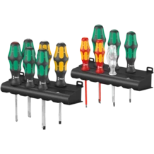 Juego universal de destornilladores de 12 piezas. El mango Kraftform multicomponente del destornillador proporciona un trabajo agradable y ergonómico que evita ampollas y callosidades. Las zonas duras de agarre permiten una alta velocidad de trabajo mientras que las zonas blandas de agarre garantizan una alta transmisión del par de giro. En parte llevan Lasertip: la punta de los destornilladores Lasertip de Wera recibe un tratamiento de lijado microscópicamente fino con ayuda de rayos láser. Esta superficie rugosa se aferra fuertemente a la cabeza del tornillo. Así, ya no es posible que el útil involuntariamente se desprenda del tornillo por deslizamiento. Sistema de búsqueda de herramienta "Take it easy" con marcas de color según perfiles y marcado del tamaño - para encontrar la herramienta precisa de forma más fácil y rápida.