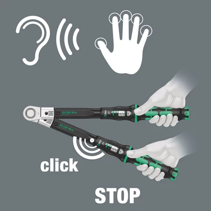 Las llaves dinamométricas Click-Torque con toma para las herramientas de inserción permiten un apriete tanto hacia la derecha como hacia la izquierda.
