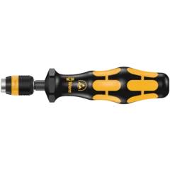 Destornillador dinamométrico de Wera. Ofrece una protección segura ante energía electrostática y los daños que ésta puede causar. Con un valor del par dinamométrico fijamente preajustado de fábrica en el menor valor de la escala. Adecuado para todas aquellas aplicaciones en las cuales es necesario que se tenga un valor del par constantemente igual y en los que se requiera una alta exactitud repetitiva. El valor del par de apriete se puede modificar dentro del área de medición con una herramienta adicional (el juego de recalibración es obtenible bajo el número de código 05137003001). Luego, el valor ajustado ha de verificarse con ayuda de un aparato corriente de medición del par de giro. Con sistema de cambio rápido para un cambio ultrarrápido de puntas. Se tiene un par de desapriete ilimitado para poder soltar tornillos agarrotados. El mango tipo Kraftform es multicomponente y dispone de zonas duras y blandas para una mayor velocidad de trabajo así como un mayor cuidado de la superficie de la mano del usuario. Adecuado para puntas con arrastre de tipo Halfmoon de 4 mm (serie de Wera 9) y de tipo HIOS de 4 mm (serie de Wera 21).