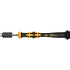 Destornillador dinamométrico de Wera. Ofrece una protección segura ante energía electrostática y los daños que ésta puede causar. Con un valor del par dinamométrico fijamente preajustado de fábrica según el deseo del cliente. Adecuado para todas aquellas aplicaciones en las cuales es necesario que se tenga un valor del par constantemente igual y en los que se requiera una alta exactitud repetitiva. El valor del par de apriete se puede modificar dentro del área de medición con una herramienta adicional (el juego de recalibración es obtenible bajo el número de código 05137001001). Luego, el valor ajustado ha de verificarse con ayuda de un aparato corriente de medición del par de giro. Se dispone de la tecnología Rapidaptor - el sistema de cambio rápido para un cambio superveloz de las puntas. Se tiene un par de desapriete ilimitado para poder soltar tornillos agarrotados. El mango tipo Kraftform es multicomponente y dispone de zonas duras y blandas para una mayor velocidad de trabajo así como un mayor cuidado de la superficie de la mano del usuario. Adecuado para puntas con arrastre de hexágono exterior de 1/4"según la norma DIN ISO 1173-C 6,3 y E 6,3 (ISO 1173).