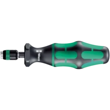 Destornillador dinamométrico de Wera. Con un valor de escala del par dinamométrico fijamente preajustado de fábrica en el menor valor de la escala. Adecuado para todas aquellas aplicaciones en las cuales es necesario que se tenga un valor del par constantemente igual y en los que se requiera una alta exactitud repetitiva. El valor del par de apriete se puede modificar dentro del área de medición con una herramienta adicional (el juego de recalibración es obtenible bajo el número de código 05137001001). Luego, el valor ajustado ha de verificarse con ayuda de un aparato corriente de medición del par de giro. Se tiene un par de desapriete ilimitado para poder soltar tornillos agarrotados. Se dispone de la tecnología Rapidaptor - el sistema de cambio rápido para un cambio superveloz de las puntas. Adecuado para puntas con arrastre de hexágono exterior de 1/4"según la norma DIN ISO 1173-C 6,3 y E 6,3 (ISO 1173). El mango tipo Kraftform es multicomponente y dispone de zonas duras y blandas para una mayor velocidad de trabajo así como un mayor cuidado de la superficie de la mano del usuario.