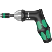Destornillador dinamométrico de Wera. El mango es tipo Kraftform de pistola para una transmisión de la fuerza especialmente alta. El mango es multicomponente y permite así unas velocidades de trabajo especialmente altas y un trabajo sumamente ergonómico. Con un valor del par dinamométrico fijamente preajustado de fábrica según el deseo del cliente. Adecuado para todas aquellas aplicaciones en las cuales es necesario que se tenga un valor del par constantemente igual y en los que se requiera una alta exactitud repetitiva. El valor del par de apriete se puede modificar dentro del área de medición con una herramienta adicional (el juego de recalibración es obtenible bajo el número de código 05137002001). Luego, el valor ajustado ha de verificarse con ayuda de un aparato corriente de medición del par de giro. Se tiene un par de desapriete ilimitado para poder soltar tornillos agarrotados. Se dispone de la tecnología Rapidaptor - el sistema de cambio rápido para un cambio superveloz de las puntas. Adecuado para puntas con arrastre de hexágono exterior de 1/4"según la norma DIN ISO 1173-C 6,3 y E 6,3 (ISO 1173). El mango tipo Kraftform es multicomponente y dispone de zonas duras y blandas para una mayor velocidad de trabajo así como un mayor cuidado de la superficie de la mano del usuario.