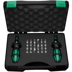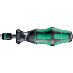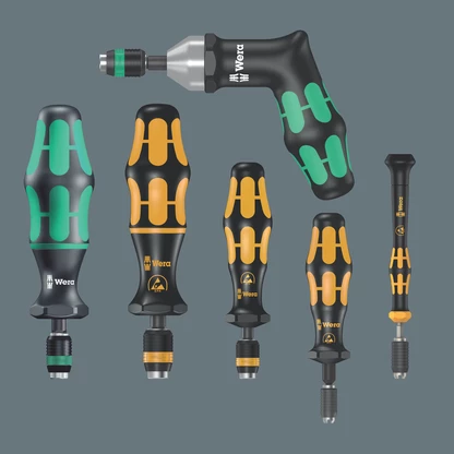 Destornillador dinamométrico de Wera. Con un valor de escala del par dinamométrico fijamente preajustado de fábrica en el menor valor de la escala. Adecuado para todas aquellas aplicaciones en las cuales es necesario que se tenga un valor del par constantemente igual y en los que se requiera una alta exactitud repetitiva. El valor del par de apriete se puede modificar dentro del área de medición con una herramienta adicional (el juego de recalibración es obtenible bajo el número de código 05137002001). Luego, el valor ajustado ha de verificarse con ayuda de un aparato corriente de medición del par de giro.