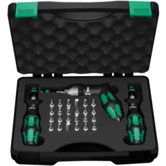 Destornillador dinamométrico de Wera. El mango es tipo Kraftform de pistola para una transmisión de la fuerza especialmente alta. El mango es multicomponente y permite así unas velocidades de trabajo especialmente altas y un trabajo sumamente ergonómico. Con un valor del par dinamométrico fijamente preajustado de fábrica según el deseo del cliente. Adecuado para todas aquellas aplicaciones en las cuales es necesario que se tenga un valor del par constantemente igual y en los que se requiera una alta exactitud repetitiva. El valor del par de apriete se puede modificar dentro del área de medición con una herramienta adicional (el juego de recalibración es obtenible bajo el número de código 05137002001). Luego, el valor ajustado ha de verificarse con ayuda de un aparato corriente de medición del par de giro. Se tiene un par de desapriete ilimitado para poder soltar tornillos agarrotados. Se dispone de la tecnología Rapidaptor - el sistema de cambio rápido para un cambio superveloz de las puntas. Adecuado para puntas con arrastre de hexágono exterior de 1/4"según la norma DIN ISO 1173-C 6,3 y E 6,3 (ISO 1173). El mango tipo Kraftform es multicomponente y dispone de zonas duras y blandas para una mayor velocidad de trabajo así como un mayor cuidado de la superficie de la mano del usuario.