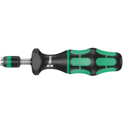 Destornillador dinamométrico de Wera. Con un mango Kraftform tipo pistola para una transmisión del par de giro especialmente alta, multicomponente para mayores velocidades en aplicaciones de atornillar así como para un trabajo especialmente ergonómico. Un ajuste del par de giro variable con altísima precisión del valor. El ajuste del valor del par de giro necesario es muy descomplicado y se puede realizar sin herramienta auxiliar. La escala de valores se logra leer muy fácilmente. La tecnología Rapidaptor de cambio rápido permite un cambio ultrarrápido de las puntas. El par de desapriete es ilimitado para que se puedan soltar tornillos fuertemente agarrotados. Con un mango Kraftform multicomponente que dispone de una zona dura y una zona blanda para alcanzar altas velocidades de trabajo y, al mismo tiempo, cuidar la palma de la mano del usuario. Adecuado para puntas con arrastre hexagonal exterior de 1/4" según la norma DIN ISO 1173-C 6,3 y E 6,3 (ISO 1173).