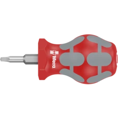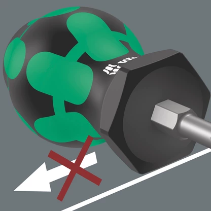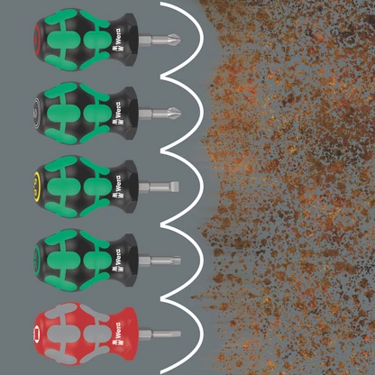 Destornilladores especialmente pequeños con una varilla corta para áreas difícilmente accesibles. El mango tipo Kraftform bicomponente dispone de una combinación práctica de zonas duras y zonas blandas y permite así un agarre fijo y un trabajo preciso. Las varillas incluyen todas las ventajas de la tecnología de puntas de Wera. A las varillas se les ha dado un tratamiento de superficie especial para lograr una alta protección anticorrosiva y una gran exactitud de posicionamiento dentro del tornillo. El sistema de protección contra el rodamiento mediante un hexágono evita las molestias que puede causar el hecho de que la herramienta se ruede del puesto de trabajo.