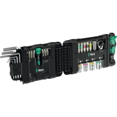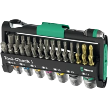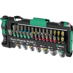 De 38 piezas. Un juego de herramientas supercompacto para el uso tanto manual como mecánico. Los elementos de bloqueo de color verde del Tool-Check sostienen las herramientas durante el transporte de forma segura. Incluye una carraca de puntas de 1/4", en versión de acero macizo forjado en estampa. El mecanismo de dientes finos (con 60 dientes) permite un ángulo de retorno mínimo de 6° para trabajos de precisión. La conmutación derecha/izquierda es muy simple. Tanto la cabeza como la palanca de la carraca tienen una forma ergonómica. Con ayuda del adaptador 870/1 de Wera que incluye el juego (de hexágono exterior de 1/4" a cuadradillo exterior de 1/4"), también es posible utilizar vasos de 1/4". 7 insertos de llaves de vaso Zyklop (de 1/4", para el uso manual y mecánico); con ranura de captación de bolas. El moleteado en el extremo posterior permite un buen agarre al atornillar en trabajos manuales. Lleva el sistema de búsqueda de herramientas Take it easy: con marcas a color según el tamaño - para encontrar la herramienta precisa de manera simple y rápida. Fabricación de cromo-vanadio en cromado mate. 28 puntas duras y resistentes (ranura en cruz Phillips y Pozidriv, TORX®, TORX® BO, ranura y cuadradillo interior) para el uso universal. Viene en el Tool-Check supercompacto y práctico.
