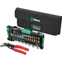 De 40 piezas. Un juego de herramientas supercompacto para el uso manual y mecánico. Los elementos de bloqueo de color verde del Tool-Check sostienen las herramientas durante el transporte de forma segura. Incluye una carraca de puntas de 1/4", en versión de acero macizo forjado en estampa. El mecanismo de dientes finos (con 60 dientes) permite un ángulo de retorno mínimo de 6° para trabajos de precisión. La conmutación derecha/izquierda es muy simple. Tanto la cabeza como la palanca de la carraca tienen una forma ergonómica. Con ayuda del adaptador 870/1 de Wera que incluye el juego (de hexágono exterior de 1/4" a cuadradillo exterior de 1/4"), también es posible utilizar vasos de 1/4". 7 insertos de llave de vaso Zyklop (de 1/4"), para el uso manual y mecánico; con ranura de captación de bolas. El moleteado en el extremo posterior permite un buen agarre al atornillar en trabajos manuales. Lleva el sistema de búsqueda de herramientas Take it easy: con marcas a color según el tamaño - para encontrar la herramienta precisa de manera simple y rápida. Fabricación de cromo-vanadio en cromado mate. 28 puntas, versión BTZ y BTH con zona BiTorsion (evita la rotura prematura de la punta) y sistema de búsqueda de herramientas Take it easy: con marcas a color según perfil y tamaño), versión resistente y dura (Z), para el uso universal, ranura en cruz Phillips y Pozidriv, TORX®, TORX® BO, ranura y hexágono interior. 1 tenazillas pico loro KNIPEX Cobra® Hightech 87 01 125. El juego viene en el Tool-Check supercompacto y práctico. 1 bolso robusto.