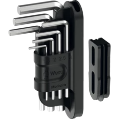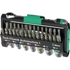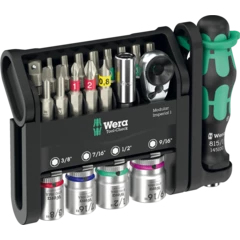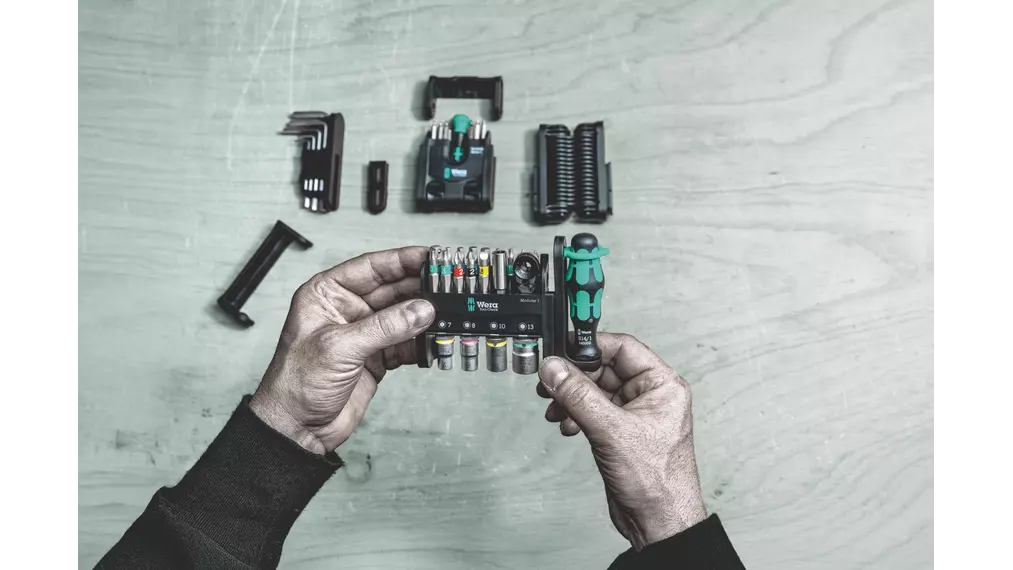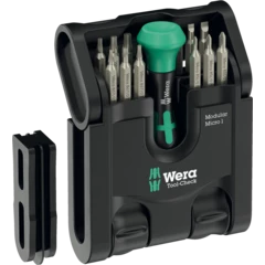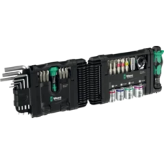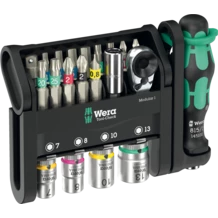 Un juego de herramientas supercompacto de 21 piezas. 1 porta-puntas manual Kraftform 815/1, adecuado para la toma de puntas de arrastre hexagonal exterior de 1/4", 1 carraca de puntas (1/4") 8011 Zyklop Mini 4, con el adaptador incluido 870/1 (de hexágono exterior de 1/4" a cuadradillo exterior de 1/4") también adecuado para llaves de vaso de 1/4", 1 porta-puntas magnético 899/4/1 para máquinas atornilladoras, 13 puntas con arrastre hexagonal exterior de 1/4" para tornillos de ranura en cruz (Phillips y Pozidriv), TORX®, tornillos de hexágono interior y de ranura. Puntas BiTorsion (BTZ) para una vida útil más larga de la herramienta, 4 llaves de vaso Zyklop 8790 HMA, 1/4". Viene en el Tool-Check Modular 1 muy compacto. El juego puede ser conectado con otros elementos del sistema Tool-Check Modular por medio del adaptador rígido Tool-Check Modular adaptador 9549, o también con ayuda de la bisagra flexible Tool-Check Modular bisagra 9550.