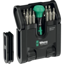 Juego supercompacto de herramientas de 21 piezas para trabajos de atornillar de mécánica de precisión. 1 porta-puntas Kraftform Micro 1014, adecuado para la toma de puntas con arrastre hexagonal exterior de 4 mm, 20 puntas con arrastre hexagonal exterior de 4 mm para tornillos de ranura en cruz (Phillips y Pozidriv), TORX®, de hexágono interior y de ranura. Resistentes y duras para el uso universal. 1 adaptador 9549, por medio del cual se pueden conectar diferentes componentes del sistema Tool-Check Modular. El juego viene en el Tool-Check Modular Micro 1 muy compacto.
