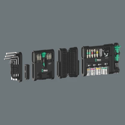 Juego supercompacto de herramientas Tool-Check Modular Set 1. Se compone de: 1 Tool-Check Modular 1, 1 Tool-Check Modular Micro 1, 1 Tool-Check Modular Llaves acodadas Hex-Plus 1, 1 adaptador 9549 y 1 bisagra flexible 9550 (adaptador y bisagra sirven para conectar los productos del Tool-Check Modular).