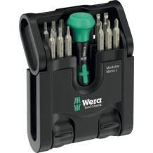 Juego supercompacto de herramientas de 21 piezas para trabajos de atornillar de mécánica de precisión. 1 porta-puntas Kraftform Micro 1014, adecuado para la toma de puntas con arrastre hexagonal exterior de 4 mm, 20 puntas con arrastre hexagonal exterior de 4 mm para tornillos de ranura en cruz (Phillips y Pozidriv), TORX®, de hexágono interior y de ranura. Resistentes y duras para el uso universal. 1 adaptador 9549, por medio del cual se pueden conectar diferentes componentes del sistema Tool-Check Modular. El juego viene en el Tool-Check Modular Micro 1 muy compacto.