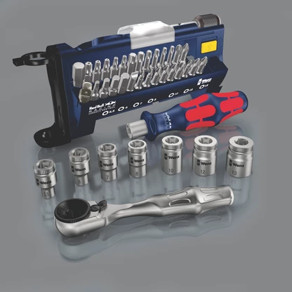 Imprescindible para todos los amantes del motorismo que exigen una herramienta de altísima calidad: El juego Red Bull Racing Tool-Check PLUS - made by Wera. Una combinación de herramientas que se compone de carraca, puntas, vasos, sistema de cambio rápido y un mango para el destornillador, todo en un espacio mínimo. ¡Un juego ultracompacto! Con una carraca de puntas para aquellos casos en los cuales, por falta de espacio, no es posible trabajar a máquina o con la herramienta convencional. Construido de forma robusta, completamente de acero forjado en estampa. Con un mango tipo Kraftform para un trabajo agradable y ergonómico. Con el sistema de cambio rápido para un cambio ultrarrápido de las puntas con la máquna de atornillar. Incluye 7 vasos (de 1/4"), 28 puntas y un adaptador para los vasos.