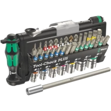 28 puntas, 1 destornillador porta-puntas 813 adecuado para puntas hexagonales de 1/4" según DIN ISO 1173-C 6,3 y serie de conexión de Wera 1; 1 porta-puntas Rapidaptor, 1 adaptador 870/1 (hexagonal de 1/4" y cuadradillo de 1/4"), 7 vasos (de 1/4"). 1 carraca de puntas Zyklop Mini 1 Wera, de acero forjado y estampado; adecuada para puntas hexagonales de 1/4" según DIN ISO 1173-C 6,3 y E 6,3 y series de conexión de Wera 1 y 4; por medio del adaptador de Wera 870/1 también es posible utilizar vasos de 1/4".