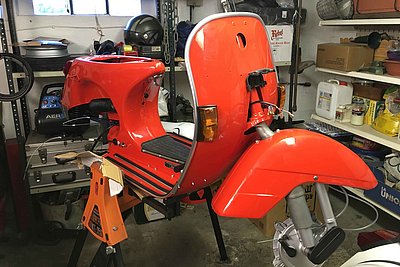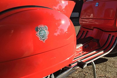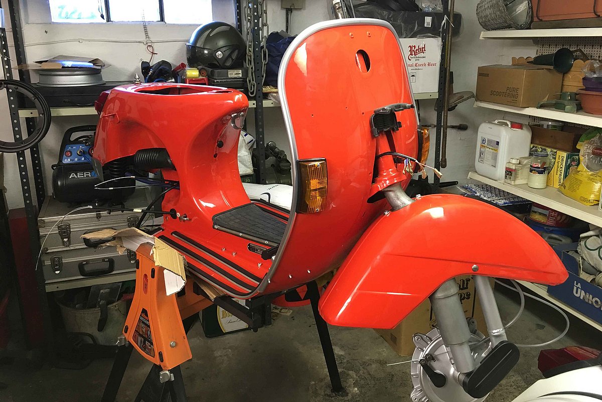 La mayor parte del trabajo se ha invertido en una Vespa PX80, también visualmente en naranja. Rescatada del desguace, ahora contiene un año y medio de trabajo. No solo el motor y la caja de cambios han sido completamente renovados, sino que toda la carrocería ha sido limpiada de óxido, soldada y reparada.