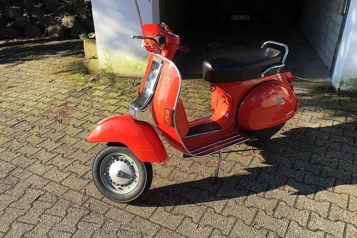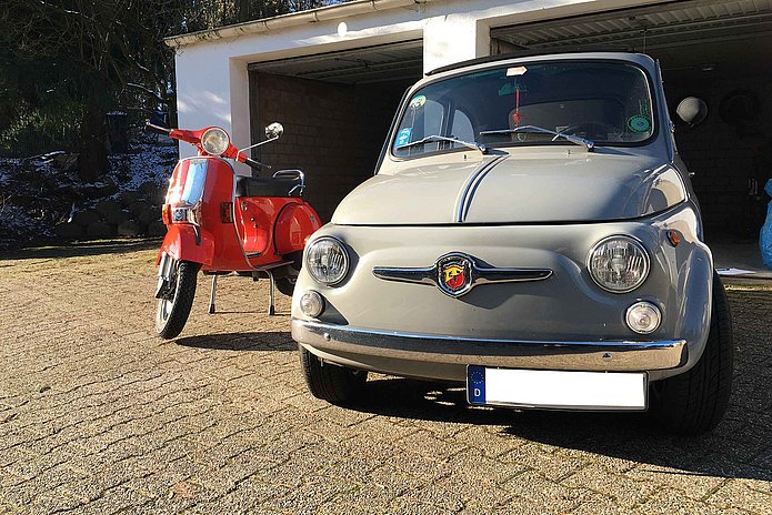 En el garaje, un poco en segundo plano pero no fuera de la atención: una Vespa PX 125. La Vespa de 1981 está casi en su estado original y acumuló polvo durante casi 10 años antes de ser completamente restaurada técnicamente y mejorada visualmente, luciendo ahora excelente. La pintura naranja es la original de fábrica. Al igual que el Fiat 500, esta Vespa también está registrada y en uso. Aquí no se restauran solo vehículos de exhibición. En el taller del mecánico de Wuppertal hay más proyectos italianos. Por ejemplo, una Vespa PX 200 blanca con aproximadamente 10 caballos de fuerza ha sido restaurada técnicamente.