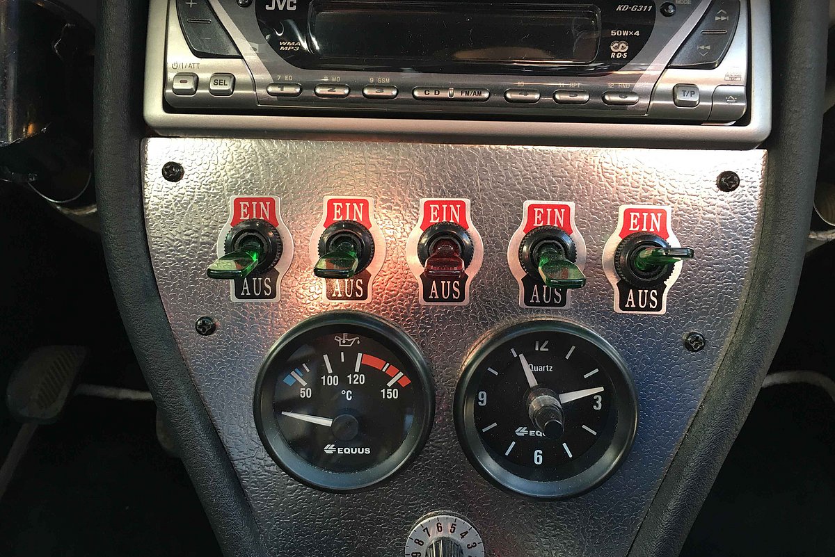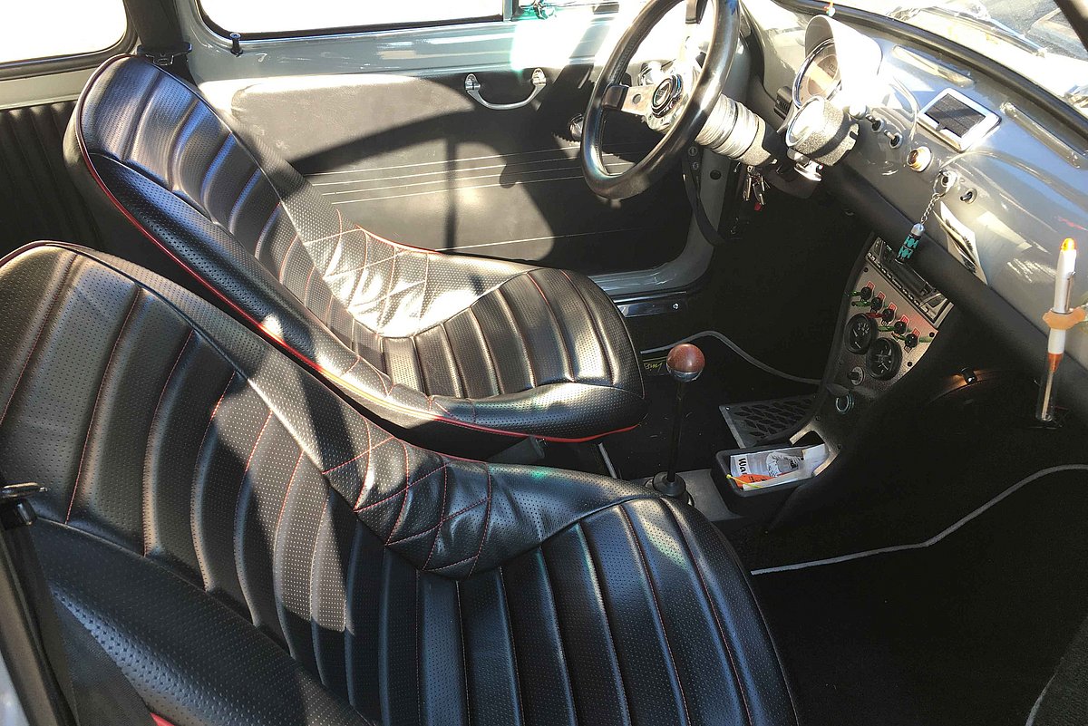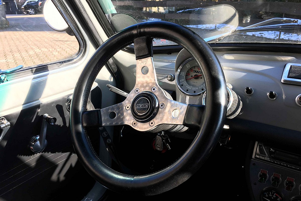 Con un peso en vacío de menos de 500 kilogramos, este motor que parece débil a primera vista ofrece una potencia sorprendente. Gracias a los frenos de disco adicionales instalados en la parte delantera, el rendimiento de frenado ahora es óptimo. Un punto destacado del Fiat es la quinta marcha adicional. La caja de cambios original se ha ampliado y el mecanismo de cambio se ha modificado. El escape deportivo y el ventilador ajustable de forma continua, construido manualmente para el interior, solo son superados por la calefacción de los asientos instalada. Una consola central hecha a medida con radio y altavoces es casi una obviedad. En y alrededor de este coche pequeño de 3 metros se pueden encontrar mejoras y componentes personalizados en casi cada rincón.