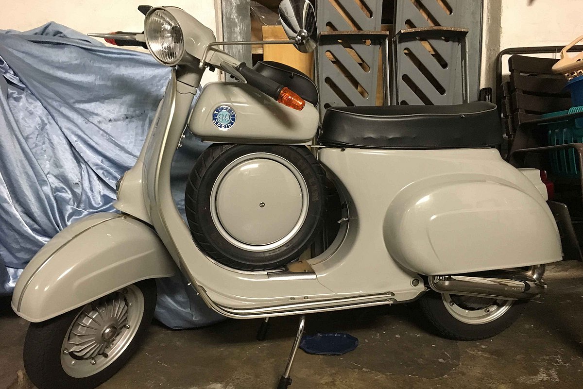 La última joya de la colección es una Vespa 90ss. Como regalo de un antiguo compañero de trabajo, esta Vespa de 1971 ha estado en posesión de „Mülli” desde los años 90. En aquel entonces, Piaggio intentó darle al scooter una apariencia de motocicleta mediante la caja de herramientas integrada en la entrada. La velocidad máxima es de aproximadamente 82 km/h, lo que ya supone un desafío en términos de chasis y frenos. Lo que hace especial a esta Vespa es la caja de herramientas como tanque falso, la rueda de repuesto vertical, el asiento acortado, el escape cromado en forma de banana y, por último, los protectores de piernas más estrechos de todas las Vespa.