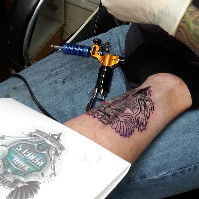 Sin embargo, una empleada de la sucursal de Osset hizo que este encuentro fuera especial. Laura ya era fanática de los tatuajes, y como nueva admiradora de Wera, llevaba con orgullo un tatuaje adhesivo de Tool Rebel. Y preguntó: "¿Qué pasaría si me hiciera un tatuaje real?" ¡Seguro que no lo decía en serio, ¿verdad?! Después de que explicamos que no podíamos asumir la responsabilidad por ello ni apoyarlo oficialmente, Laura repitió su deseo de tatuarse el logo de Tool Rebel al día siguiente. Y también a la mañana siguiente, cuando recibimos el mensaje de que estaba en la tienda de tatuajes, apenas podíamos creer que realmente lo decía en serio. ¡ESTO NO PODÍA SER VERDAD?! Sin embargo, las primeras imágenes que nos envió dejaron claro que no era una broma. No hace falta decir que todo el equipo de Wera UK perdió momentáneamente la compostura, seguido de la realización, la satisfacción y la gratitud de que no solo los empleados de Wera quieren llevar adelante con pasión la idea de Tool Rebel. No es algo cotidiano que instalemos un Innovation Tower en un minorista, demos una breve capacitación sobre productos y que uno de los clientes esté tan inspirado que se tatúe un recuerdo permanente de nosotros en su pierna a la mañana siguiente!